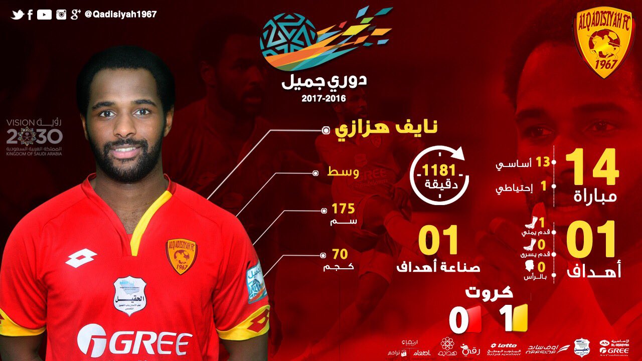 نايف بن احمد هزازي اللقب : ويُحاول الاتحاد ضم هزازي منذ عدة أسابيع وقد تقدم بعرضين لشراء اللاعب لكن القادسية رفضهما مؤكدًا عزمه التمسك باللاعب صاحب الـ25 عامًا. بدأ لاعب فريق العدالة نايف هزازي برنامجه التأهيلي واللياقي استعداداً للانخراط في التدريبات الجماعية التي يقودها المدرب ناصيف البياوي الذي أوصى الإدارة العدلاوية بالتعاقد معه، وذلك للاستفادة من خبرته في الملاعب وتدعيم خط هجوم الفريق الأحسائي فيما تبقى. وشبه هزازي خلال تصريح لإحدى الصحف الرياضية، نفسه بلاعب كرة القدم العالمي السابق زين الدين زيدان مدرب فريق ريال. إبراهيم بن سعود الدخيّل twitter.com/asmdnsk.